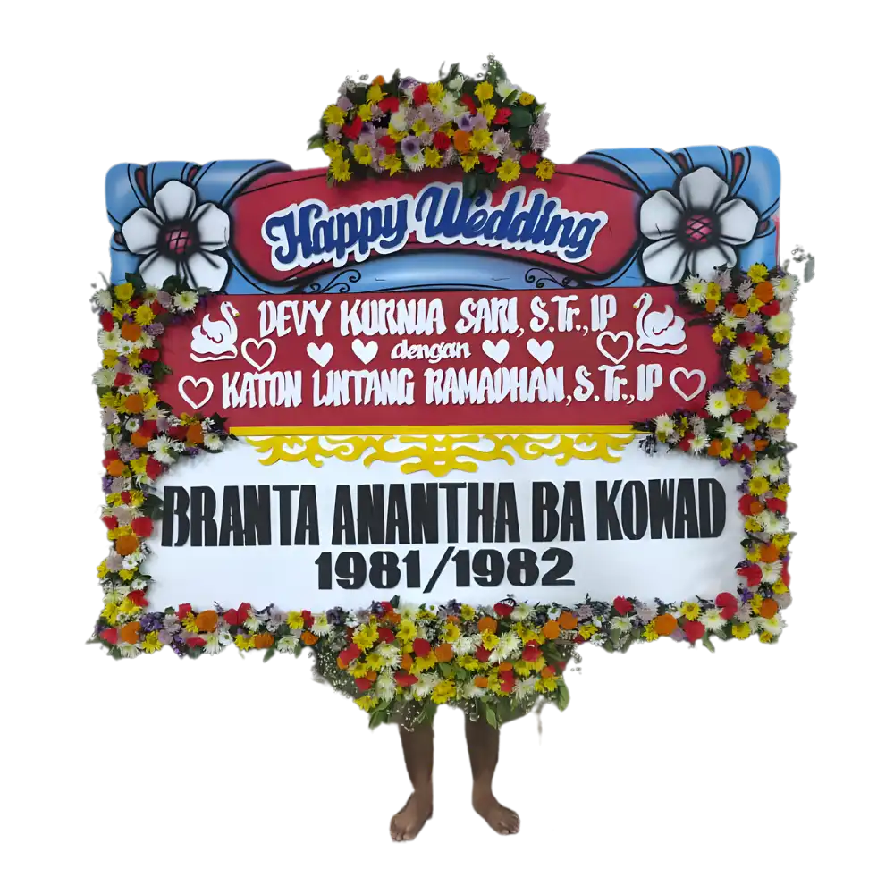 Rayakan Hari Bahagia Mereka dengan Ucapan Selamat yang Paling Megah! Sebuah pernikahan adalah perayaan cinta yang pantas dimeriahkan. Bunga Papan "Pernikahan" kami adalah cara paling berkesan untuk menunjukkan sukacita, doa restu, dan kehadiran nama Anda di hari istimewa kedua mempelai. Model ini dirancang khusus untuk tampil "WOW". Berbeda dari papan biasa, model Bingkai Penuh (Full Border) ini dihiasi dengan rangkaian bunga segar yang melimpah di seluruh sisinya (atas, bawah, kanan, dan kiri), menciptakan tampilan yang jauh lebih mewah, padat, dan penuh warna.